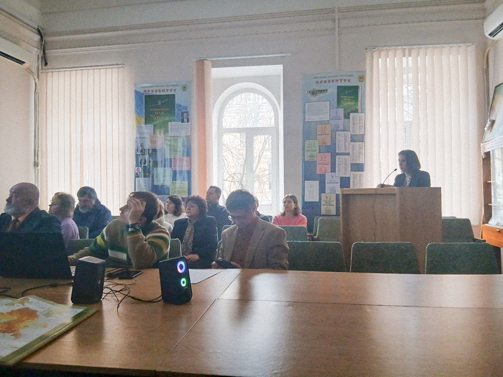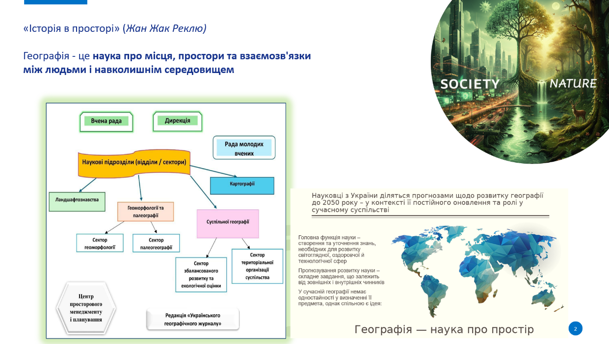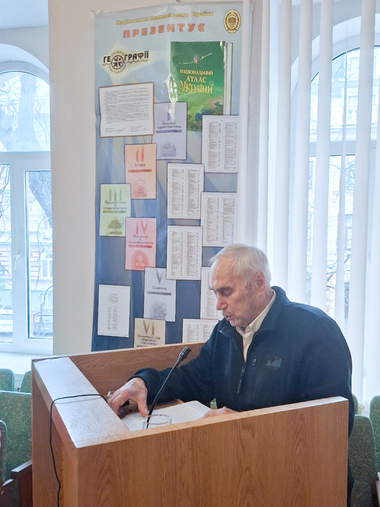 Директор Інституту географії НАН України, член-кореспондент НАН України Є. О. Маруняк розкрила зміст основних напрямів діяльності Інституту географії НАН України щодо забезпечення збалансованого розвитку України та її регіонів, атласного та ГІС картографування, природничих та суспільно-географічних досліджень, окремо відзначила корегування тематики досліджень установи у зв’язку з багатосторонніми викликами перед наукою та суспільством, пов’язаними з російсько-українською війною, висвітлила основні здобутки установи, експертну та міжнародну діяльність, а також окреслила подальші перспективи її розвитку.