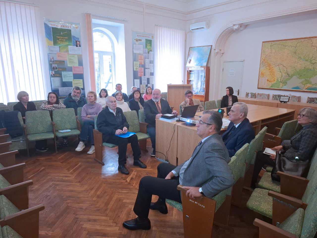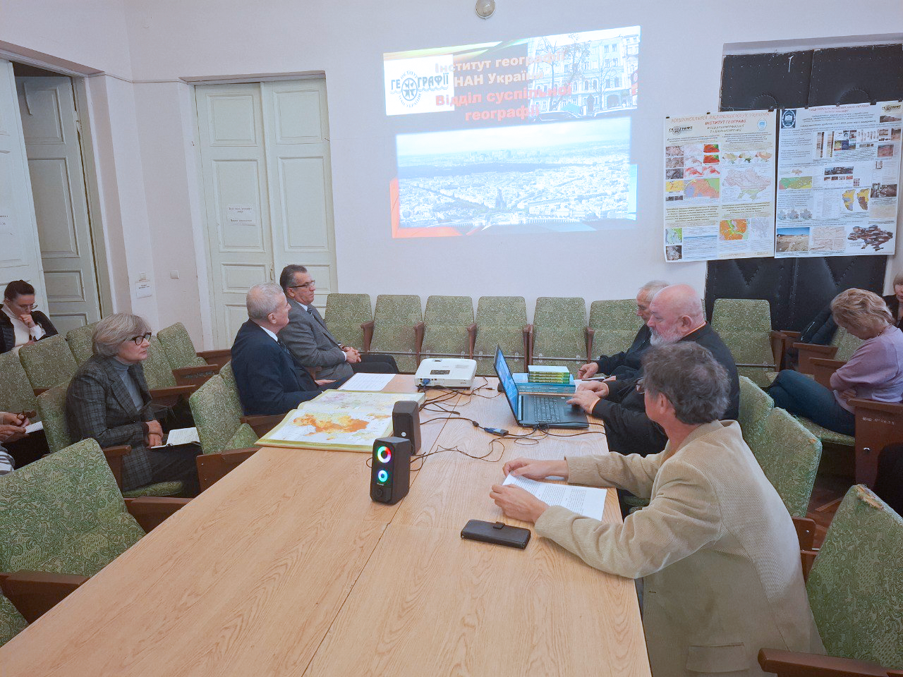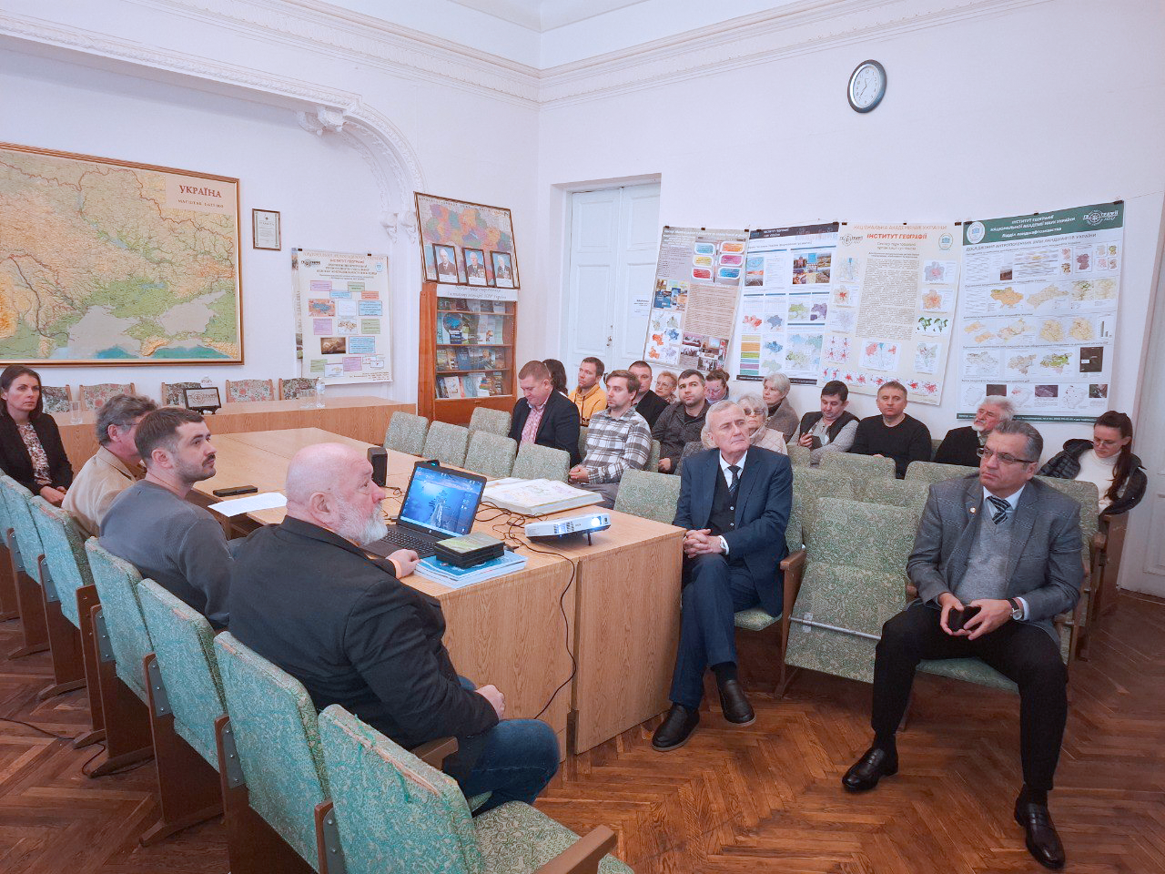 Із основними науковими здобутками інших наукових підрозділів Інституту (суспільно-географічних та природничих) познайомили присутніх заступник директора з наукової роботи, завідувач відділу суспільної географії член-кореспондент НАН України С. А. Лісовський та завідувач відділу геоморфології та палеогеографії кандидат географічних наук Р. О. Спиця. Доповідачі акцентували увагу на нових здобутках підрозділів, пов’язаних з дослідженнями наслідків повномасштабного вторгнення росії, зокрема у ключі просторової справедливості на рівні територіальних громад, функціональної структуризації території України та її змін, методології ландшафтознавчого забезпечення просторового планування в Україні, досліджень геоморфогенезу урбанізованої природно-антропогенної системи м. Києва, наслідків руйнування дамби Каховської ГЕС, досліджень територіальних громад Київського Придніпров'я, що постраждали від російської агресії, у контексті резильєнтності та потенціалу відновлення аграрної сфери цих громад тощо.